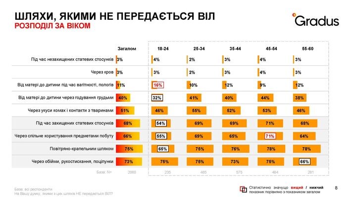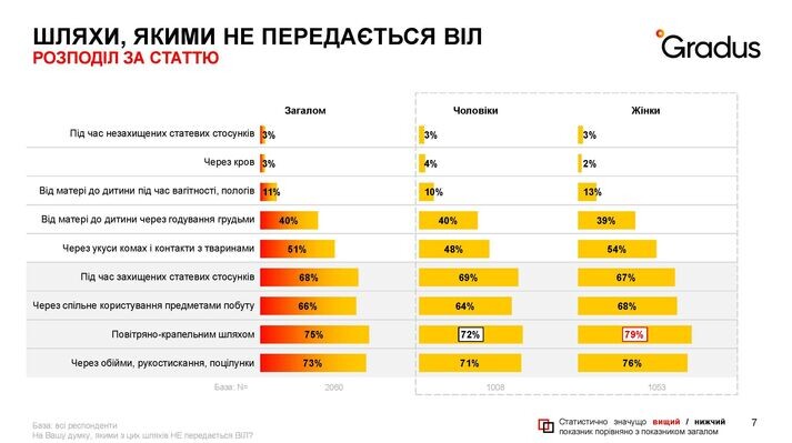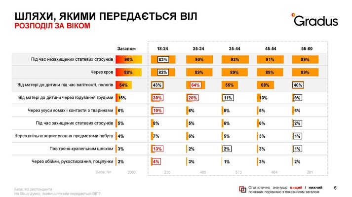 Проведене на платформі Gradus* дослідження 2023 року на замовлення Фонду Олени Пінчук показало дуже високу обізнаність українців щодо ВІЛ (97% знають що таке ВІЛ та СНІД, та 92% – знають, що можна запобігти інфікуванню). Водночас результати демонструють досить великий рівень стигматизації потенційних груп ризику. До таких груп відносять людей, які займаються проституцією (85%), споживачів наркотиків (85%), сексуальні меншини (54%), медичних працівників (43%), безхатьків (32%). Також 7% населення у віці 18-60 років до груп підвищеного ризику відносить військових. Серед основних причин називають поранення (33%), переливання крові (23%), контакт з кров’ю (18%), польову медичну допомогу (16%), контакт з пораненими ВІЛ-інфікованими (14%), незахищені статеві контакти (10%).