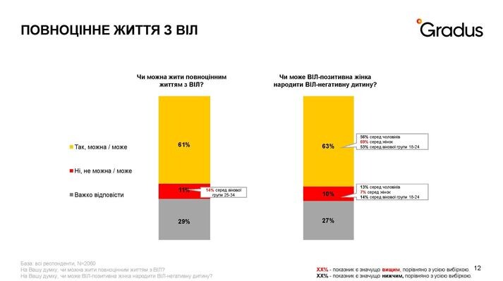 «Високий рівень стресу, життя у постійній небезпеці та напрузі, а також втома від війни призводять до того, що люди менше піклуються про власне здоров'я чи нехтують базовими принципами його збереження. Ми бачимо ці сигнали і в інших дослідженнях, які проводимо від початку повномасштабного вторгнення. Проте, результати, які ми отримали зараз, є дуже обнадійливими. Адже обізнаність про ВІЛ/СНІД серед дорослого населення України складає 97%. І це надзвичайно важливо, особливо в країні, де йде війна, і ризики поширення хвороби збільшуються», — говорить Євгенія Близнюк, соціологиня, засновниця і директорка дослідницької компанії Gradus Research.