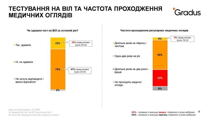 Під час дослідження було виявлено ще одну проблему: низький рівень тестування на ВІЛ. Лише 22% опитуваних декларували, що здавали тест на ВІЛ за останній рік. Цей рівень трохи вищий серед людей у віці 25-34 років: кожен третій (32%) з них здавав тест за останній рік.